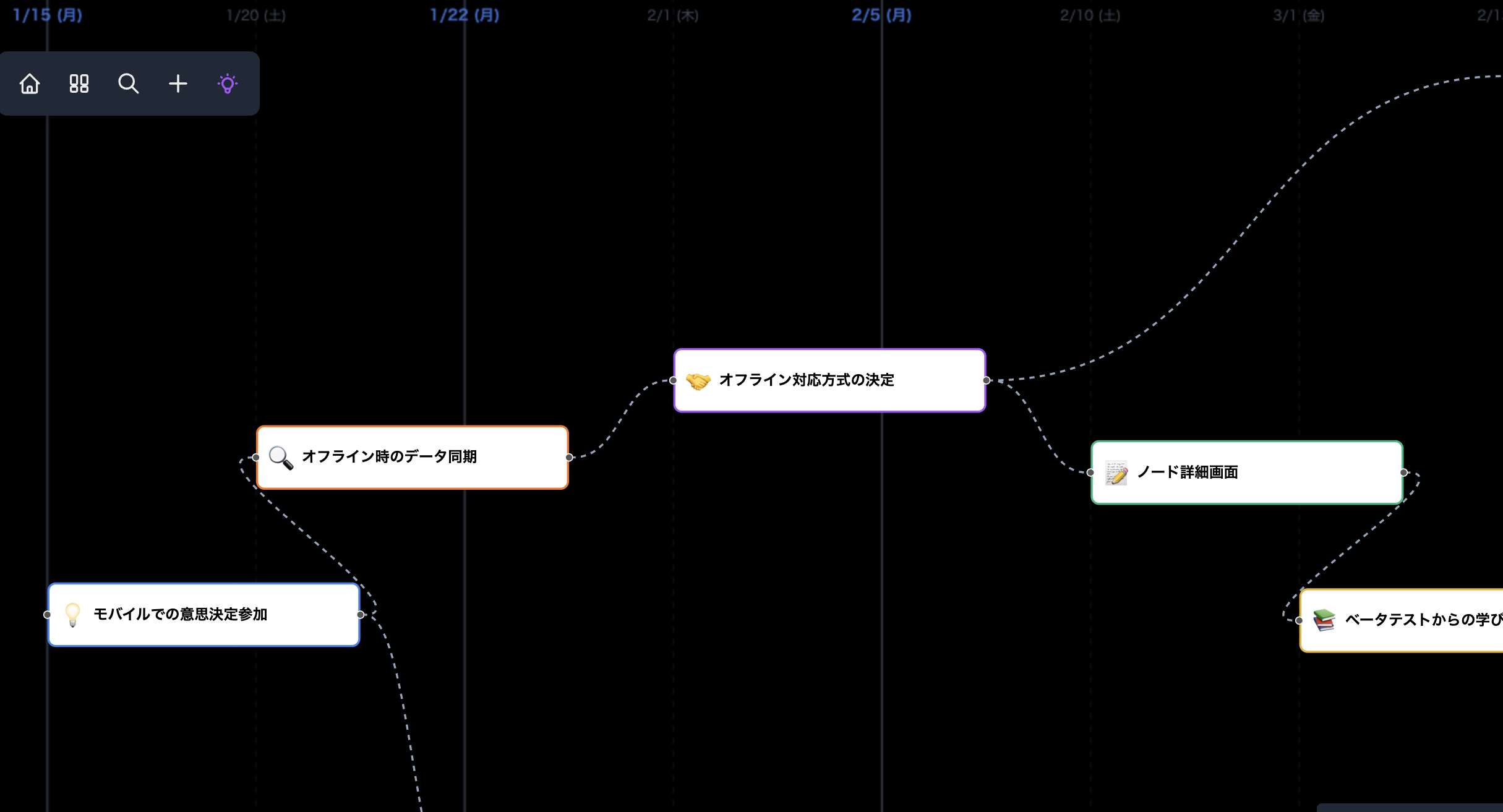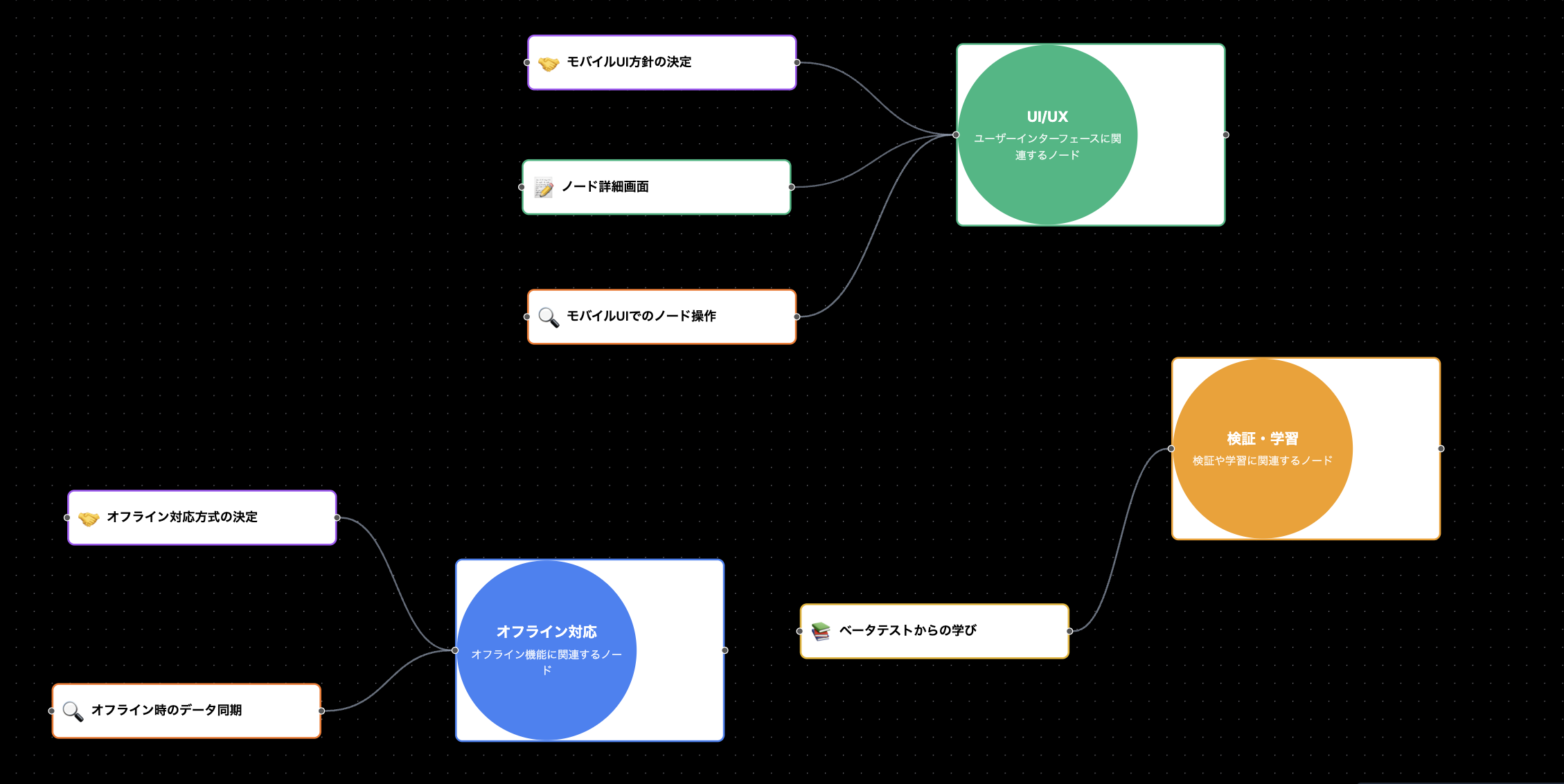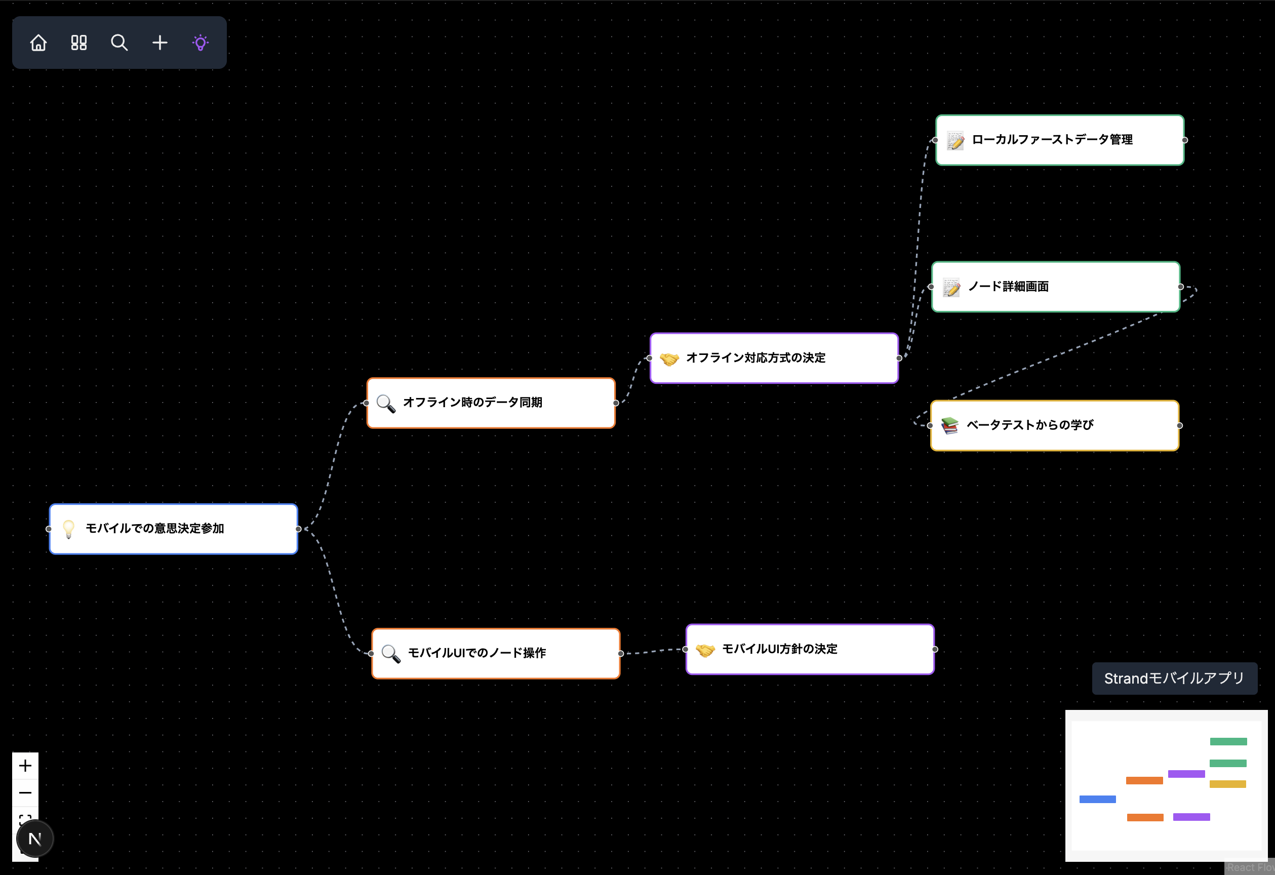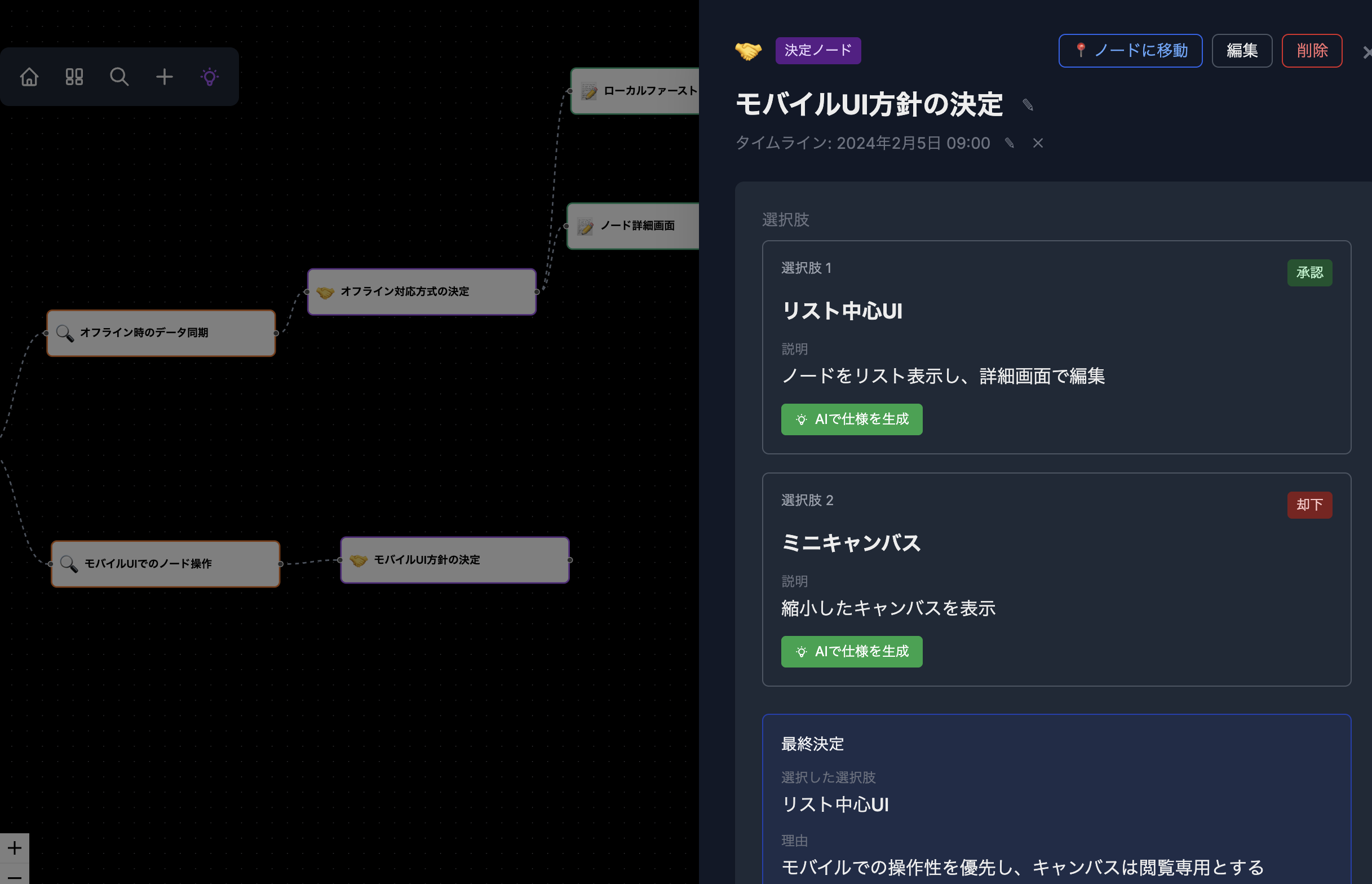 課題、仮説、決定事項をノードとしてキャンバスに配置。 関連するノードをつなげることで、意思決定の流れと根拠を一目で把握できます。